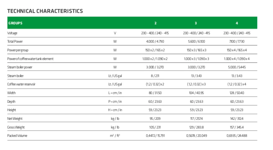 A secondary safety sensor positioned internally in the boiler, disconnects the heating element should a temperature of 169degrees celcius be reached – A function on the Central Processing Unit, disconnects the heating element should it work uninterruptedly at 100% of its capacity for longer than 60 seconds – Safety features on the individual coffee brewing boilers: – A temperature sensor, disconnects the heating element when it reaches 130 degrees celcius, and gives a visual alarm signal on the display – A secondary safety sensor, disconnects the heating element should a temperature of 150 degrees celcius be reached – The SNCR valve opens when the pressure in the hydraulic circuit surpasses 12,5 bars – A function on the Central Processing Unit, disconnects the heating element should it work uninterruptedly at 100% of its capacity for longer than 45 seconds. – USB port for the uploading and downloading of settings and parameters, in addition to software upgrades – Hot water for tea, obtained by mixing fresh water from the incoming line, and steam from the services boiler – Electronically controlled cup warmer – Temperatures in the individual coffee brewing boilers, the group heads, and the services boiler, electronically controlled with a maximum fluctuation of 0,5 degrees celcius either way – Pump operating water pressure reading, together with incoming water pressure visible on the display – Ambient humidity reading obtained by means of a hygrometer, and visible on the display – Incoming water pressure reading, visible on the display.