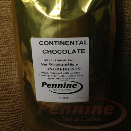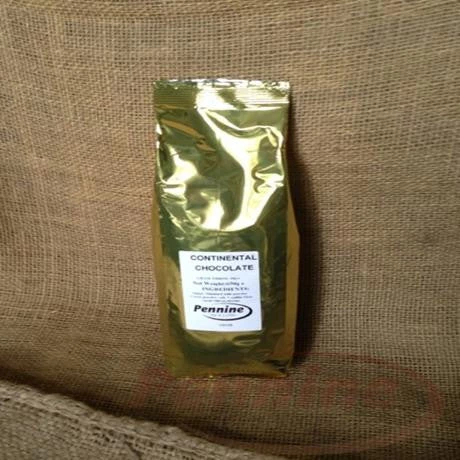 Pennine chocolate powder mix in a flow wrap bag. Instant chocolate mix that can be used with hot water to make hot chocolate, or used as chocolate powder to top cappuccino.