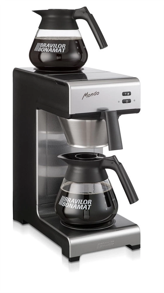 The Bravilor Mondo 2 brews delicious fresh filter coffee in decanters quickly and easily. The specially designed Bravilor Bonamat decanters maintain the fresh aroma very well. The machine is equipped with ”coffee-is-ready” signal and a descaling signal. The self-regulating integral hot plates re-adjust the temperature according to the amount of coffee in the decanter guaranteeing coffee of consistent quality. The high-quality stainless steel in combination with black accents provide a contemporary design. LED controlled operation and stainless steel filter pan make our machines easy to use. A variety of models available to suit every situation. Without water connection. Options: wall mounting console, stainless steel filter pan for brewing tea, models designed specially for marine use, HP: self-regulating hot plates, cup warmer WHK preheats cups and mugs.