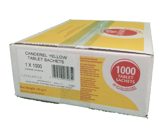 Canderel Yellow Sweetner Sachets. Packed in box’s of 1×1000 sachets. Each sachet holds one sweetner tablet.