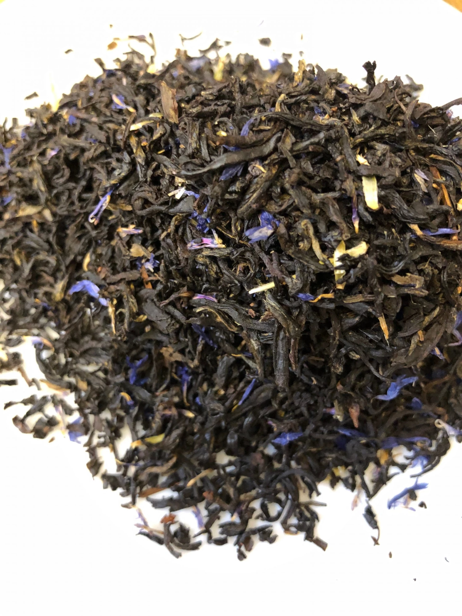 Earl Grey Blue Superior Yunnan Aromatised Tea, a slight twist on traditional Earl Grey tea. This Chinese black tea with Bergamot oil and Blue Mallow Flowers is perfect served with a slice of lemon. Provides a lighter more fragrant cup than traditional Earl Grey.