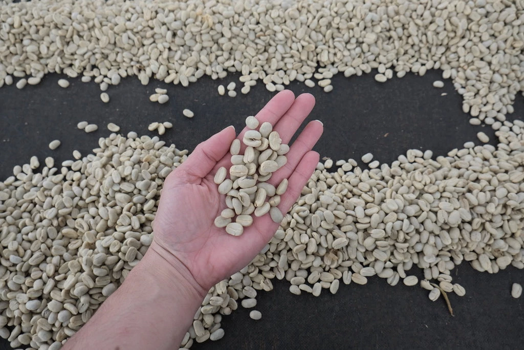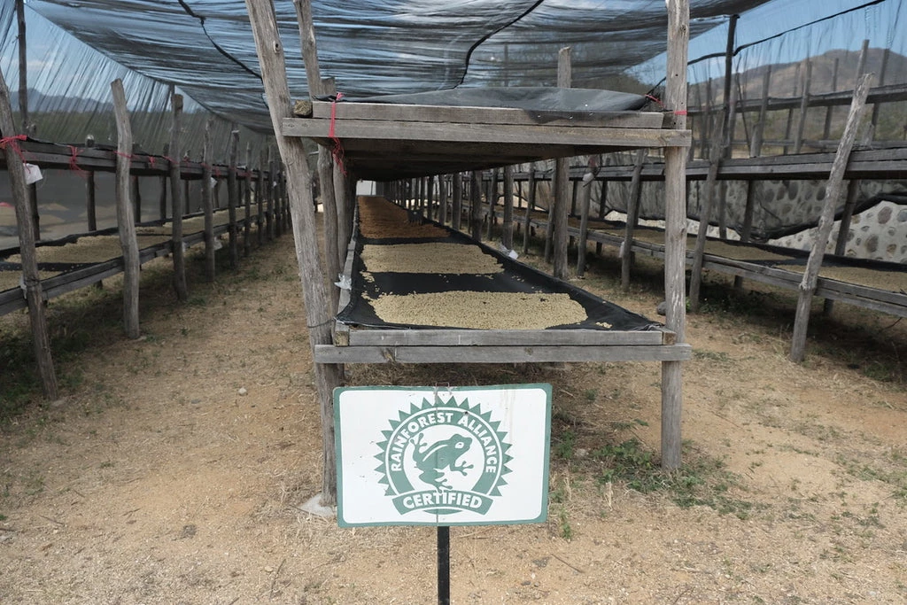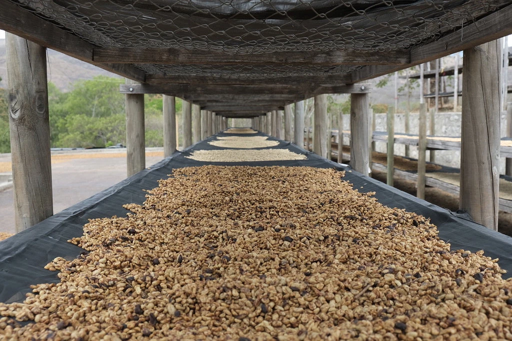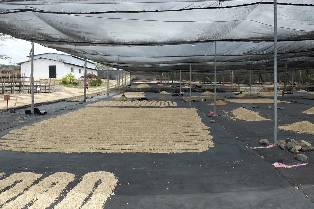 They usually start the drying in the patio, in the shade for 5-6 days and then in the sun. All patios are covered with some black net so the coffee is not directly on the floor.