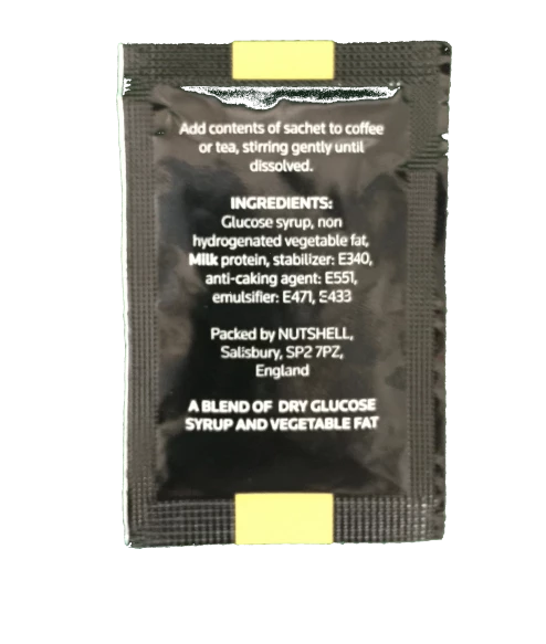Whitener sachets, dry powder in sachets for whitening tea or coffee. A blend of dried Glucose Syrup and Vegetable Fat. Caution – contains a source of milk.