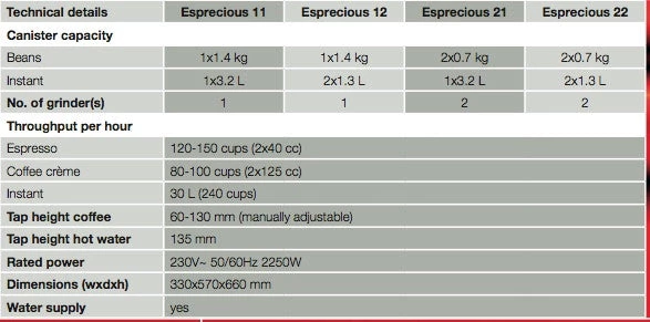 The Esprecious is not just an espresso machine. In addition to an espresso, double espresso and co ee crème you can also serve other co ee specialities in a variety of volumes up to two mugs of 150 cc. The separate hot water tap supplies hot water for tea and soup. The most common co ee specialities are pre-set in the Esprecious.