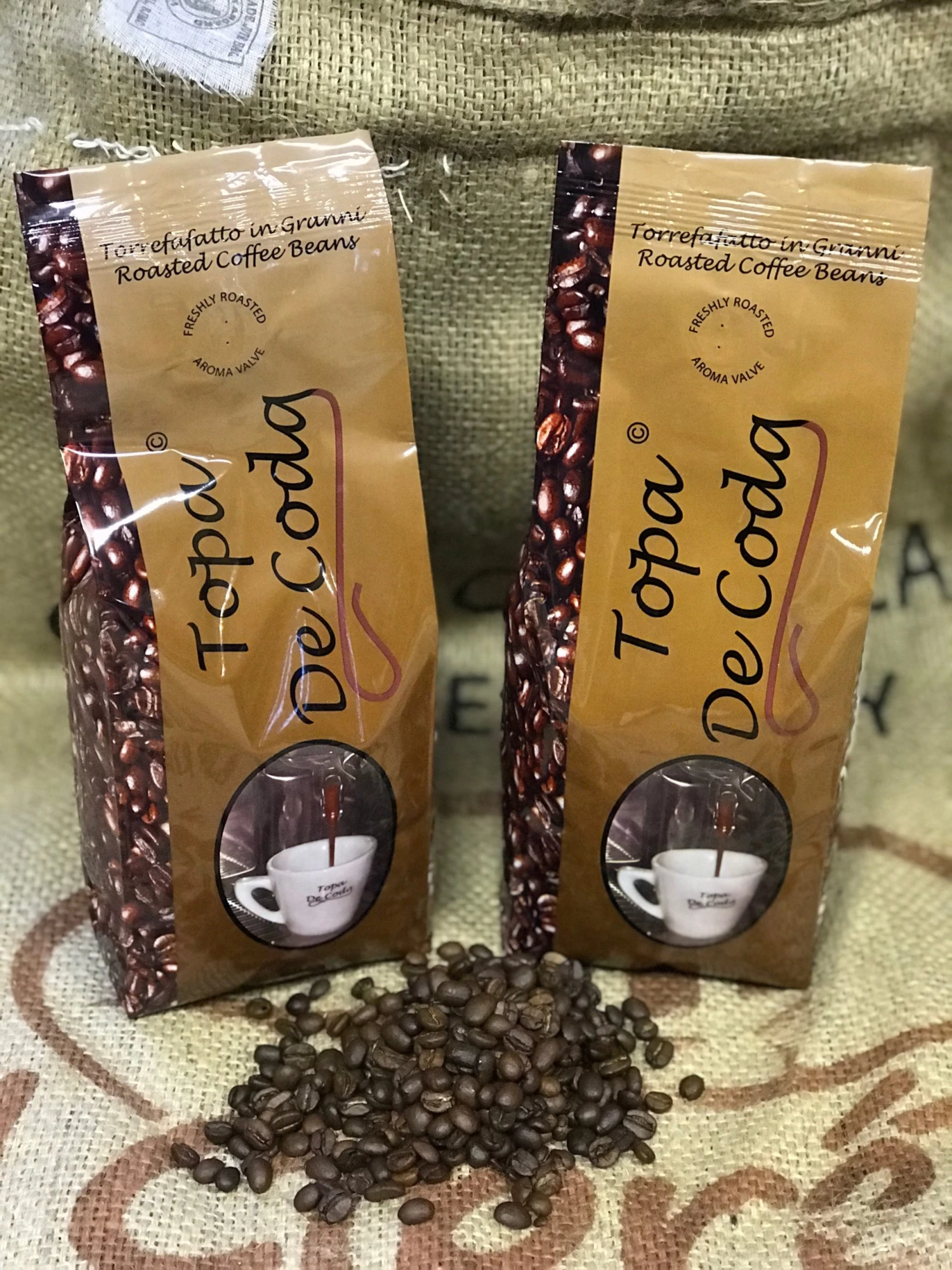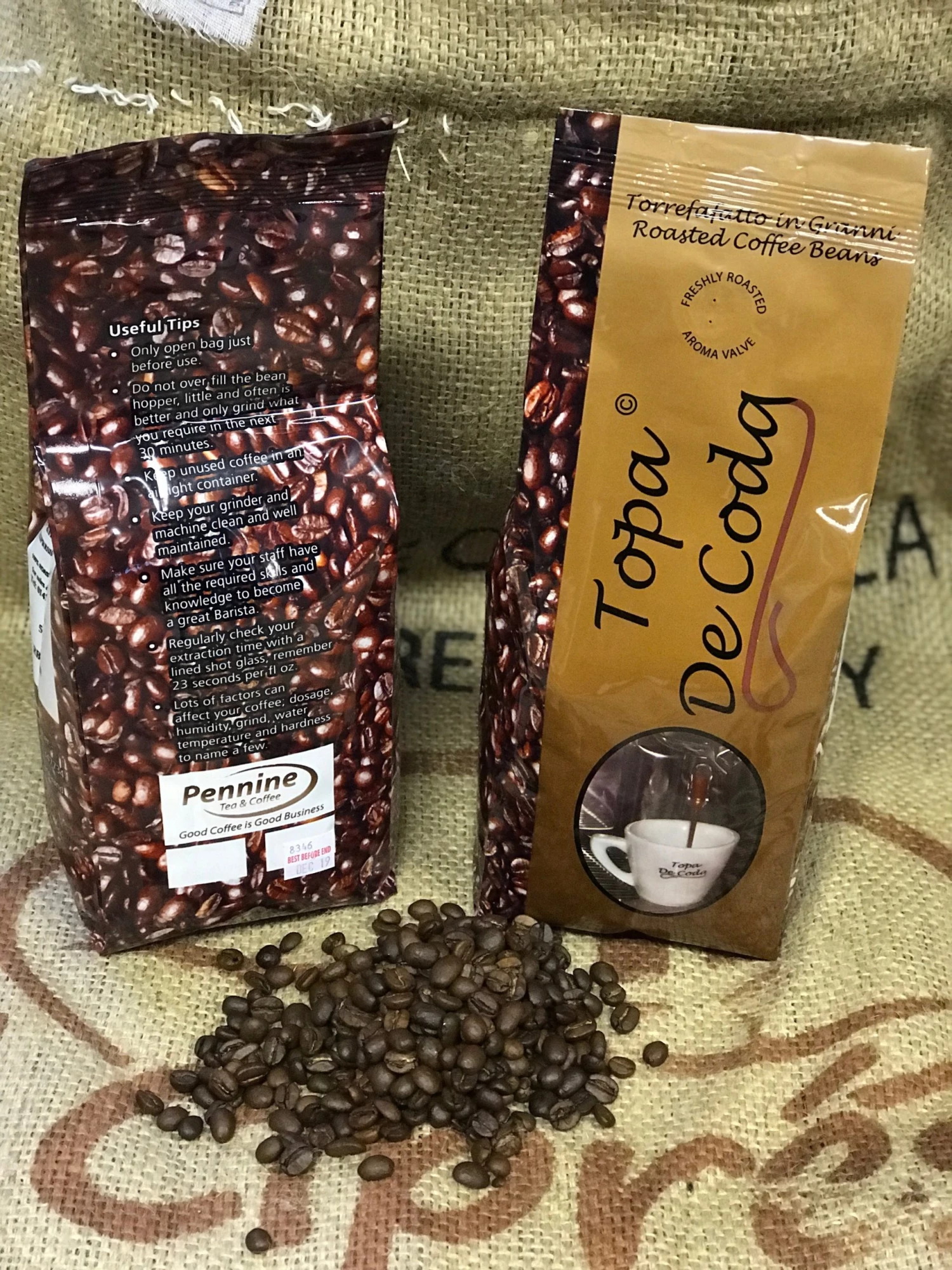 Fairtrade espresso beans, a blend of Fairtrade Mark certified origin estates roasted to contintal roast level so it is dark but not too oily. Suitable for all espresso coffee machines. The beans pictured in front of our coffee bags are the actual ones you receive, and are an accutate illustration of our rest level for this blend.