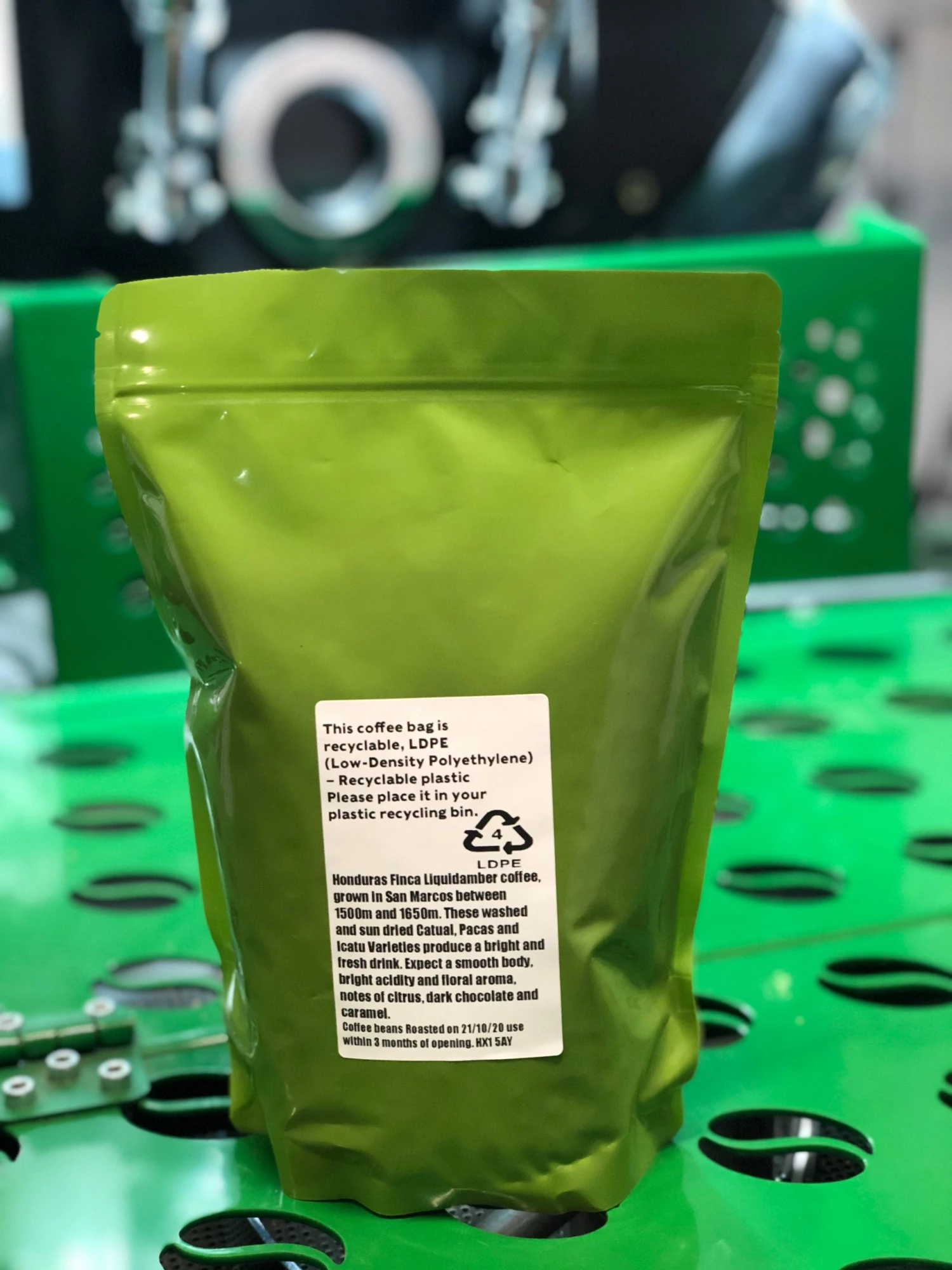 Our coffee bags are green – each coffee bag is recyclable, LDPE (Low-Density Polyethylene) – Recyclable plastic, just place it in your plastic recycling bin.