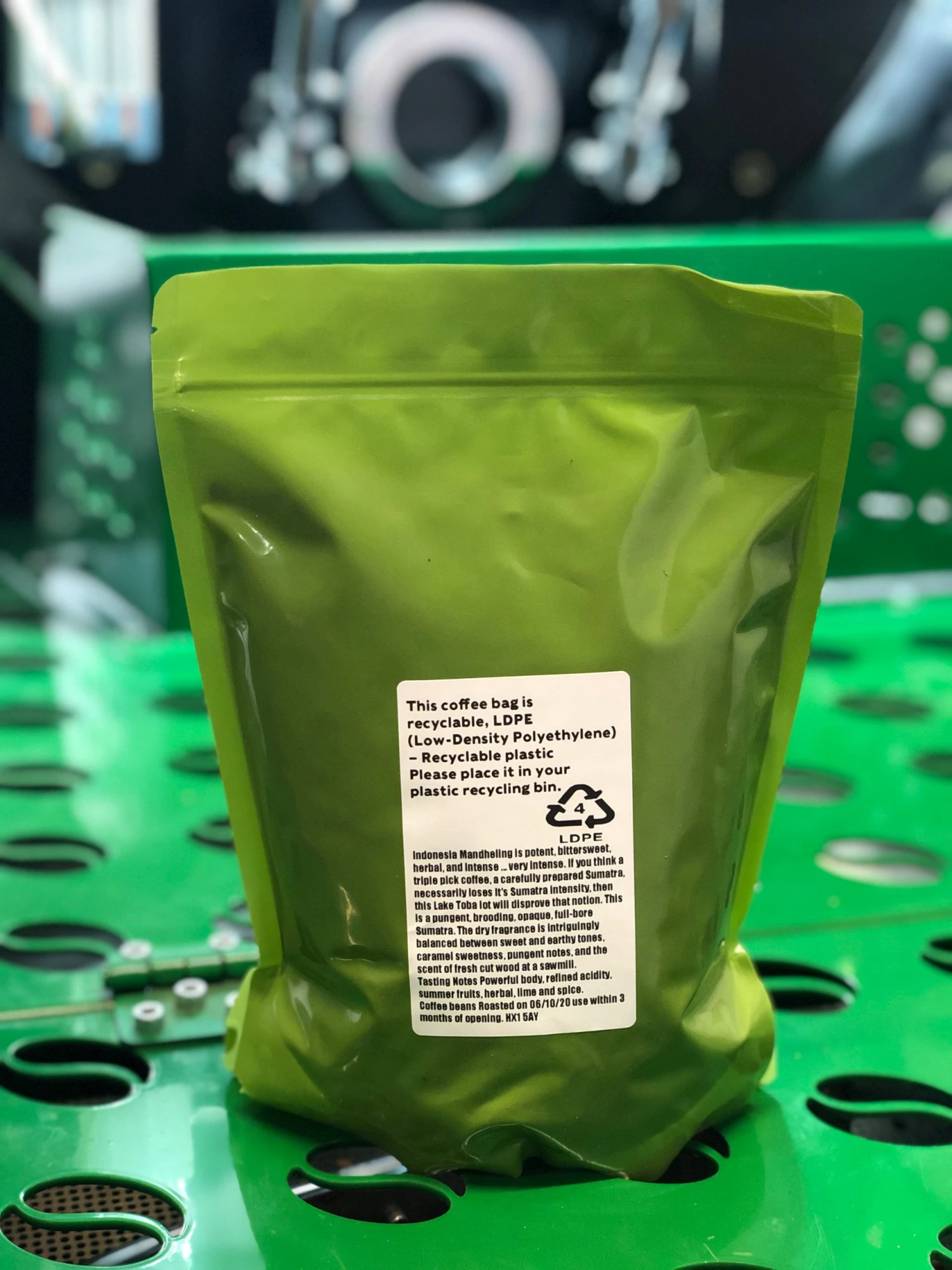 Our coffee bags are green – each coffee bag is recyclable, LDPE (Low-Density Polyethylene) – Recyclable plastic, just place it in your plastic recycling bin.