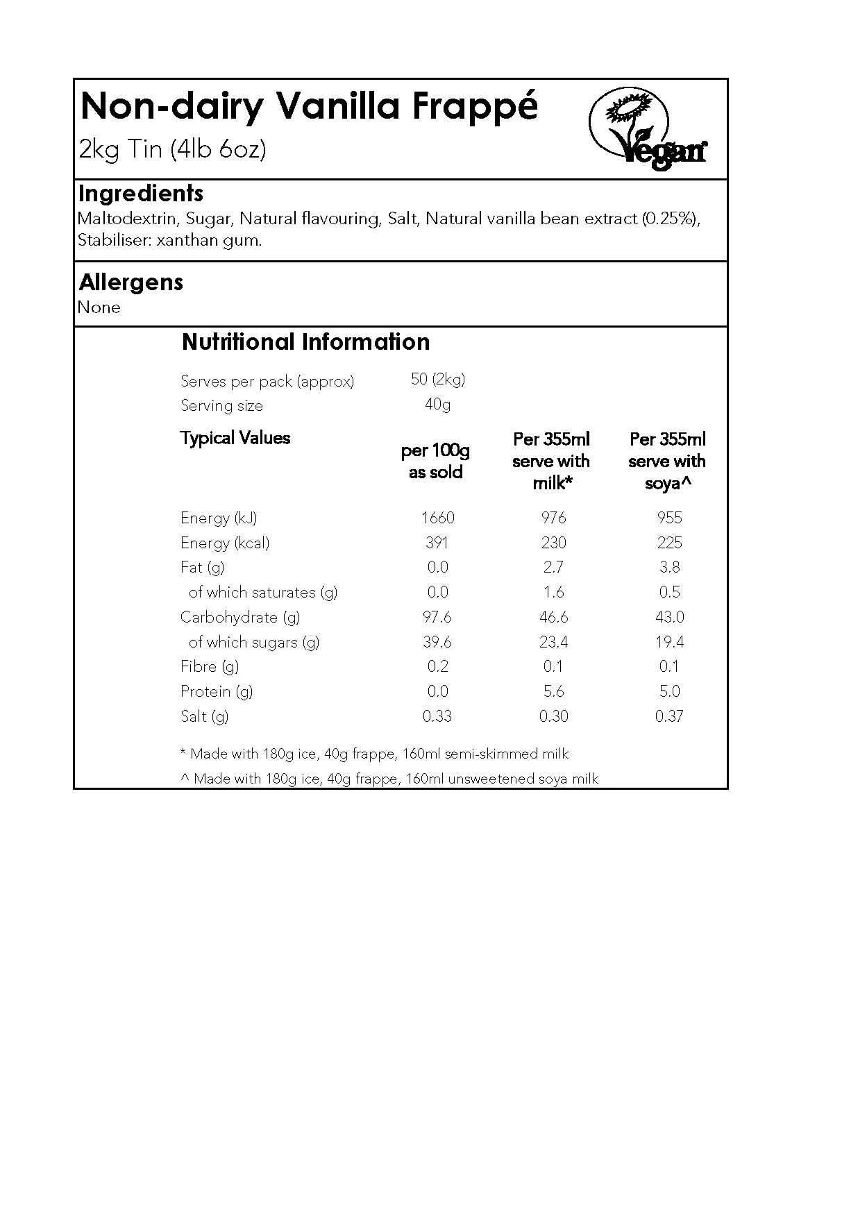 This neutral vanilla frappe mix is ideal for making your own cold coffee drinks, just add a fresh shot of your espresso to the milk, ice and blend.